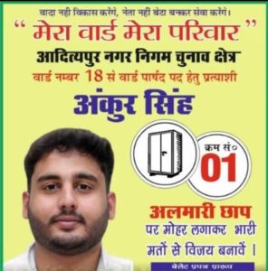 आदित्यपुर: आदित्यपुर नगर निगम वार्ड संख्या 18 के प्रत्याशी, पूर्व विधायक अरविंद सिंह (मालखान सिंह) के भतीजे और दिवंगत समाजसेवी प्रवीण सिंह के पुत्र अंकुर सिंह ने चुनाव प्रचार के अंतिम दिन अपनी पूरी ताकत झोंक दी है। ऑस्ट्रेलिया से MBA की डिग्री हासिल करने वाले अंकुर ने कॉर्पोरेट करियर के बजाय जनसेवा को चुनकर चुनावी मैदान में उतरे हैं।