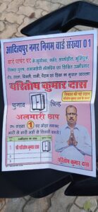 आदित्यपुर : कर्मठ और जुझारू प्रत्याशी परितोष दास ने अपने समर्थकों के साथ चुनाव प्रचार किया और जनता से अपने पक्ष में मतदान देने की अपील की। इस दौरान उन्होंने कहा कि वार्ड 1 को आदर्श वार्ड बनाने का संकल्प के साथ मैदान में उतरे हैं इसलिए यहां की जनता एक बार सेवा करने का मौका देगी तो इस वार्ड को आदर्श बनाने का काम करेंगे।