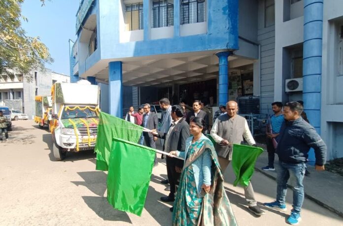 जिला दंडाधिकारी सह उपायुक्त रविशंकर शुक्ला, जिला परिषद अध्यक्ष सोनाराम बोदरा, उप विकास आयुक्त प्रवीन कुमार गागराई एवं जिला परिषद उपाध्यक्ष मधुश्री महतो के द्वारा संयुक्त रुप से आज समाहरणालय परिसर से बिरसा किसान रथ को हरी झंडी दिखाकर रवाना किया गया । इस दौरान जिला क़ृषि पदाधिकारी संजय कुमार के द्वारा उपायुक्त को बिरसा किसान रथ के परिचालन के संबंध में विस्तृत जानकारी दी गई। बताया कि कृषि, पशुपालन एवं सहकारिता विभाग, झारखण्ड के द्वारा बिरसा किसान रथ का परिचालन कृषि प्रोद्यौगिकी प्रबंधन अभिकरण “आत्मा” सरायकेला के माध्यम से प्रारम्भ की गयी है। किसानों के लिए सरकार द्वारा चलाई जा रही कल्याणकारी योजनाओं के प्रचार-प्रसार के साथ-साथ मृदा स्वास्थ्य, जैविक खेती, जल प्रबंधन, बीज उपचार, यांत्रीकरण, किसान क्रेडिट कार्ड का वितरण, मछली पालन, पशुओं का टीकाकरण, मृदा स्वास्थ्य कार्ड के वितरण आदि की जानकारी बिरसा किसान रथ के माध्यम से किसानों को दी जाएगी।