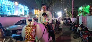 पूजा पंडाल का उद्घाटन के पहले अतिथियों का स्वागत घोड़े और गाजे-बाजे के साथ जुलूस निकालकर किया गया. इस बीच जुलूस को आयोजित समारोह तक घुमाया गया.