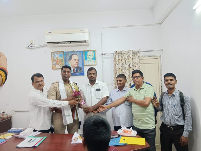 नए थानेदार को अंगवस्त्र और पुष्पगुच्छ से स्वागत